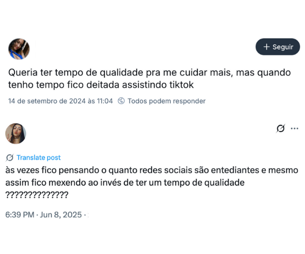 As redes sociais ocupam um lugar ambíguo. Elas podem representar descanso e lazer, mas também o oposto do tempo de qualidade: distração e ruído. O mesmo meio que conecta também desconecta. A consciência sobre o uso excessivo do celular é crescente, e o incômodo com a atenção fragmentada (própria ou do outro) aparece como um dos principais sabotadores desses momentos.