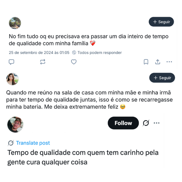 As conversas mostram que o tempo de qualidade é mais do que uma preferência. Para 40% das pessoas, ele é a principal forma de demonstrar afeto e construir vínculos, funcionando como ponte para criar memórias e fortalecer a intimidade. Nesse sentido, a ausência de tempo ou a falta de atenção no convívio (especialmente mediada por telas) é sentida como desinteresse, o que torna o tema também um termômetro relacional.